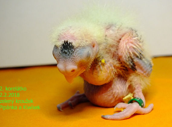 První korelátko dne 13.5.2018 ze druhé snůšky od Pipánky a Kiwíska. Má se čile k světu.